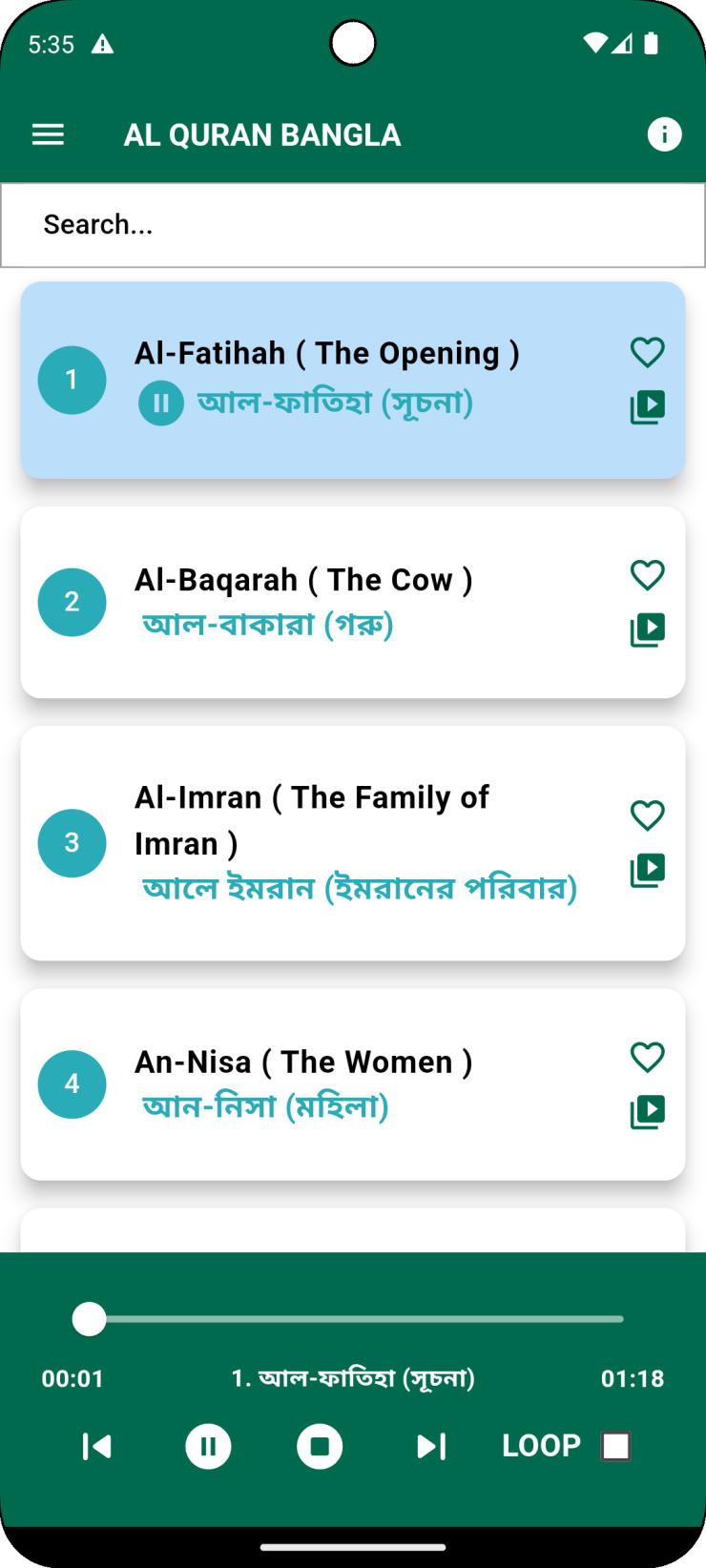 Loop Mode: Repeat your favorite Surah continuously